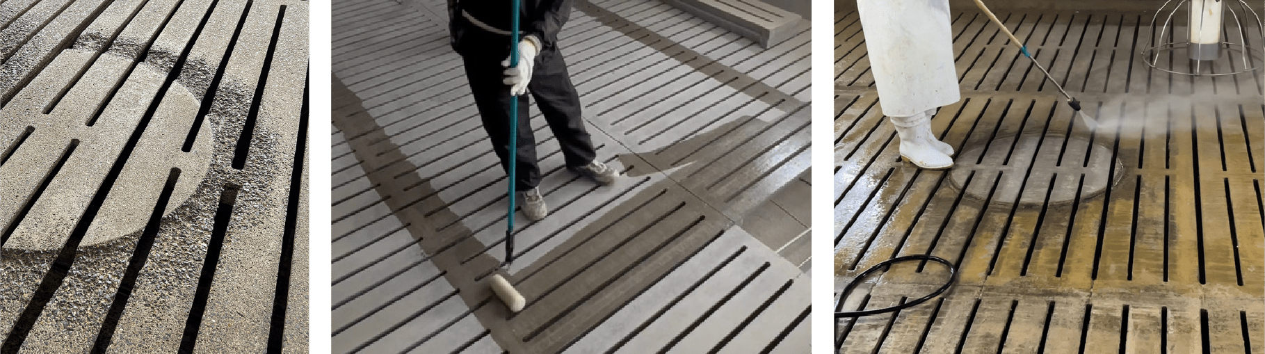 樹脂によるコーティングでコンクリート表面の祖度を低下させ糞の付着を抑制します。